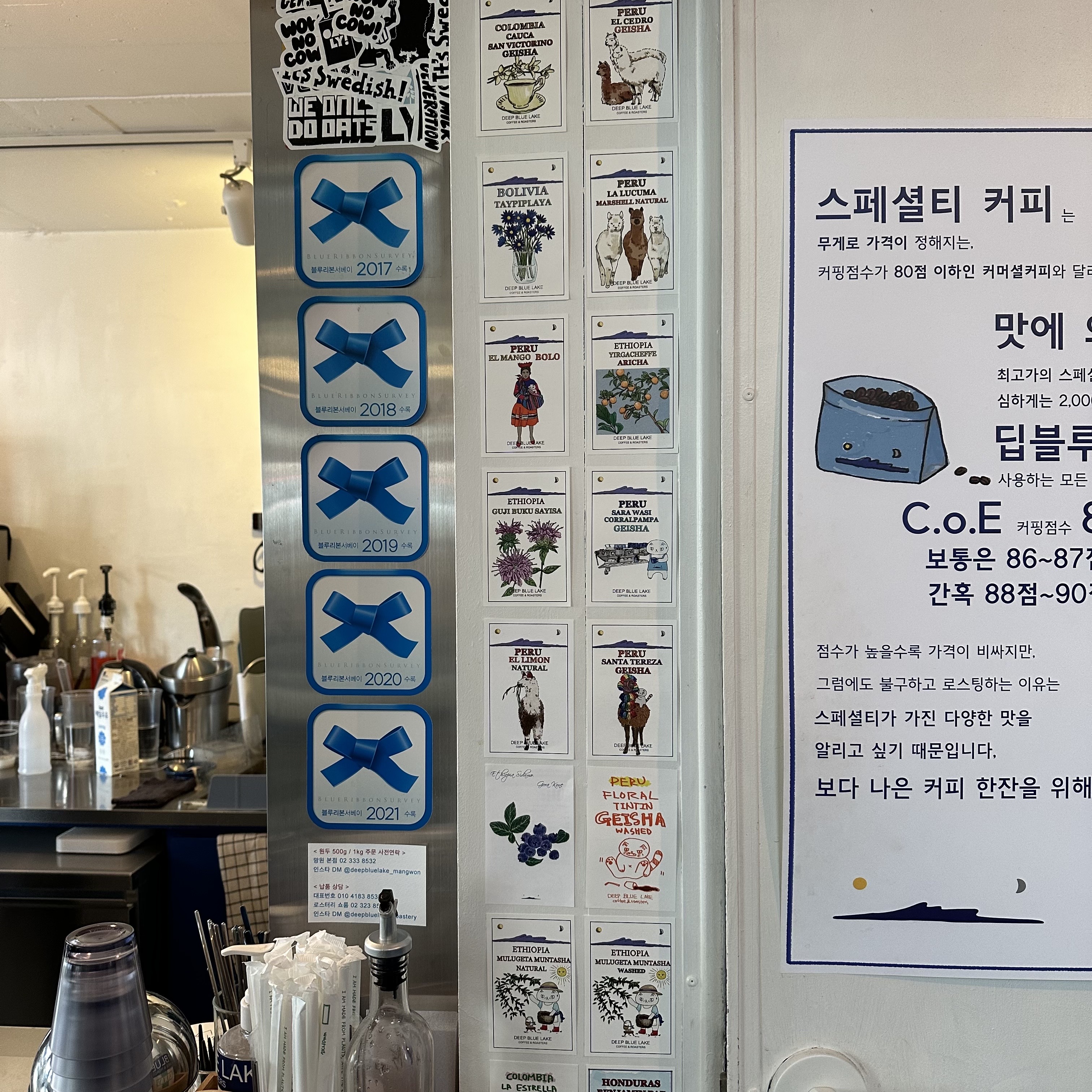 한국의 미쉐린이라고 하는 믿음직한 블루리본 스티커들. 17년도부터 블루리본을 받은 커피 맛집이라구요..! 커피바 맞은편에서는 직접 원두를 선별하고, 로스팅도 하는 공간이 따로 마련되어져 있습니다.