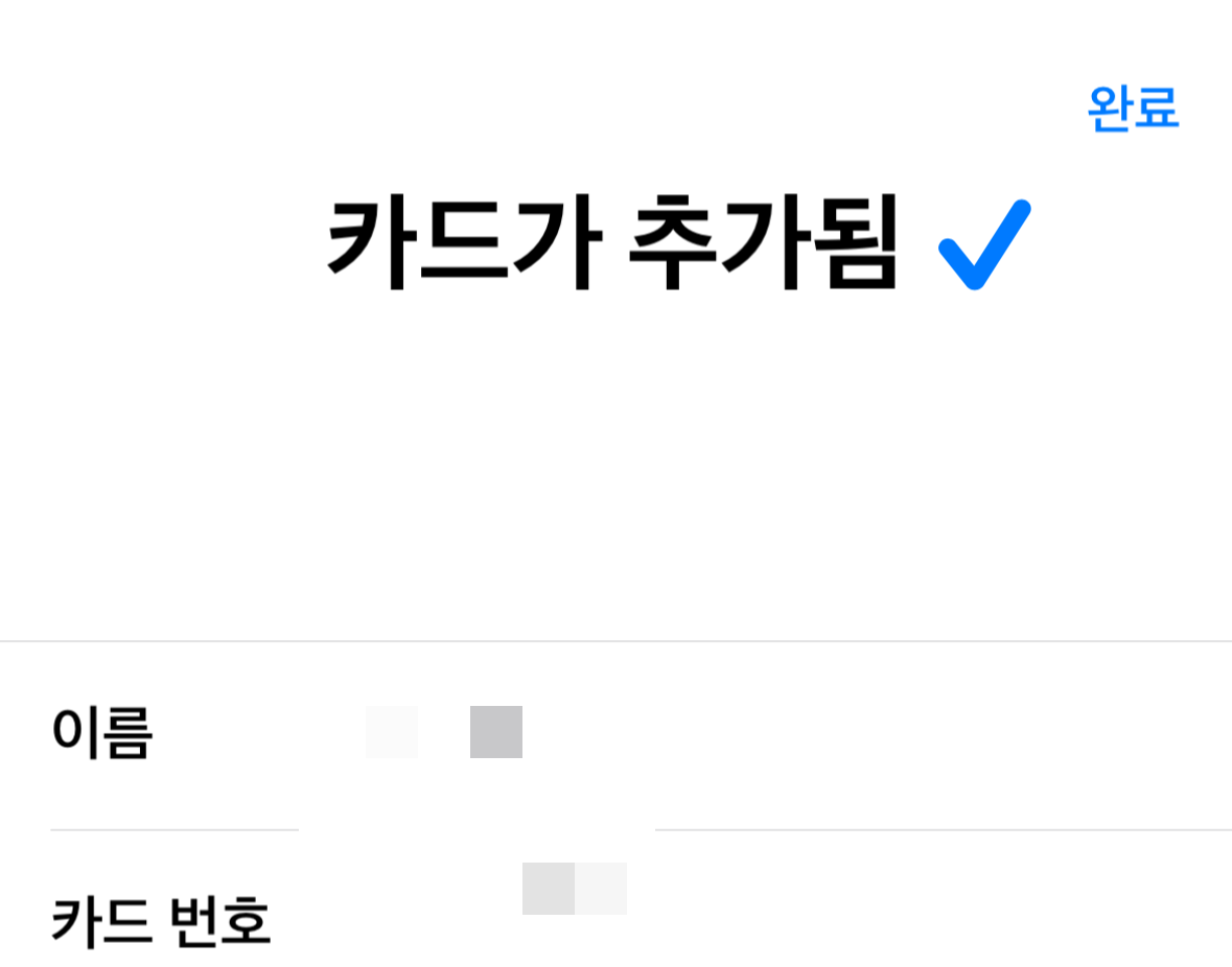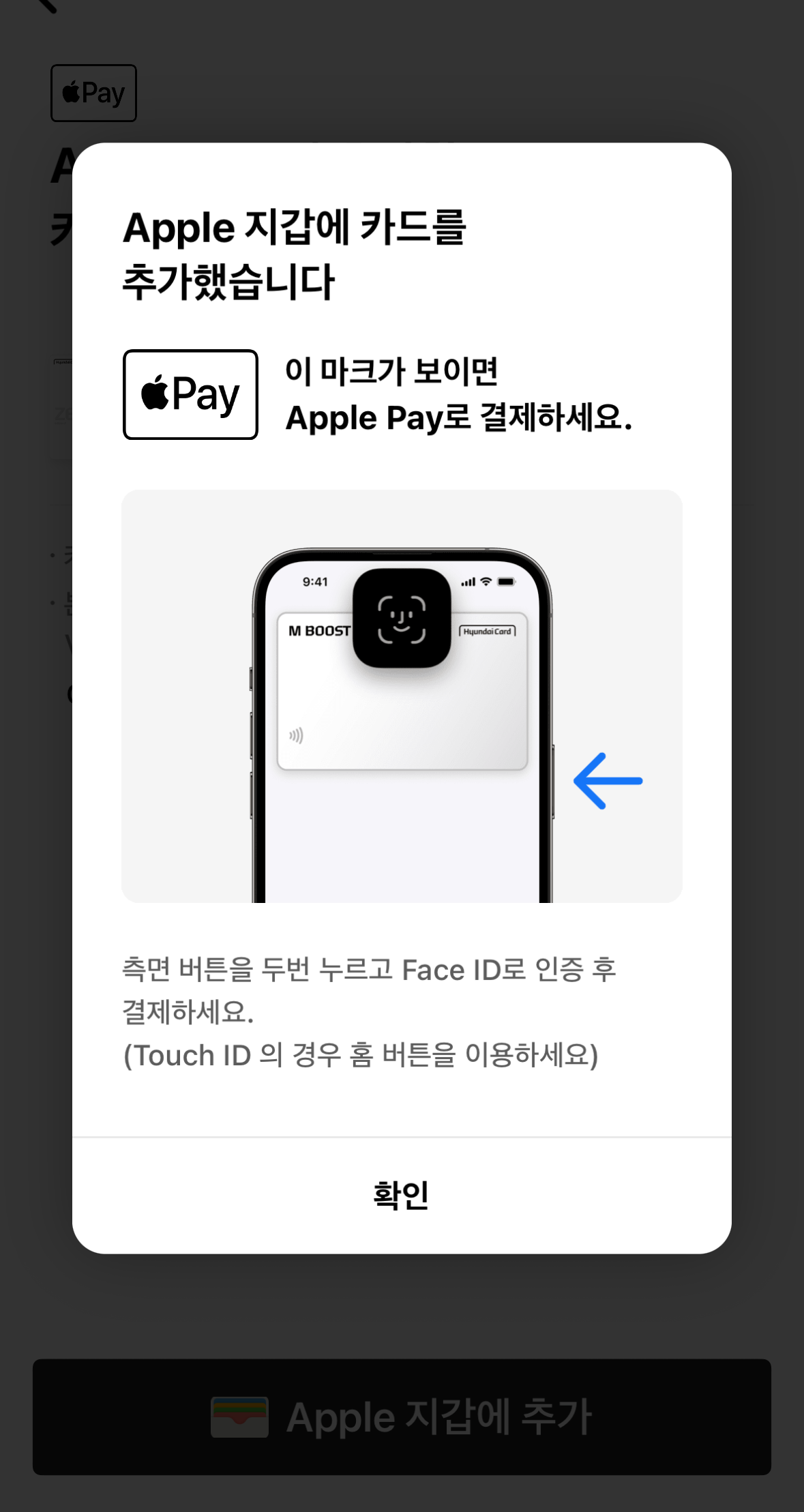 이렇게 카드가 정상적으로 추가가 되었다는 팝업이 뜹니다. 이제 애플페이로 결제가 가능해졌습니다!